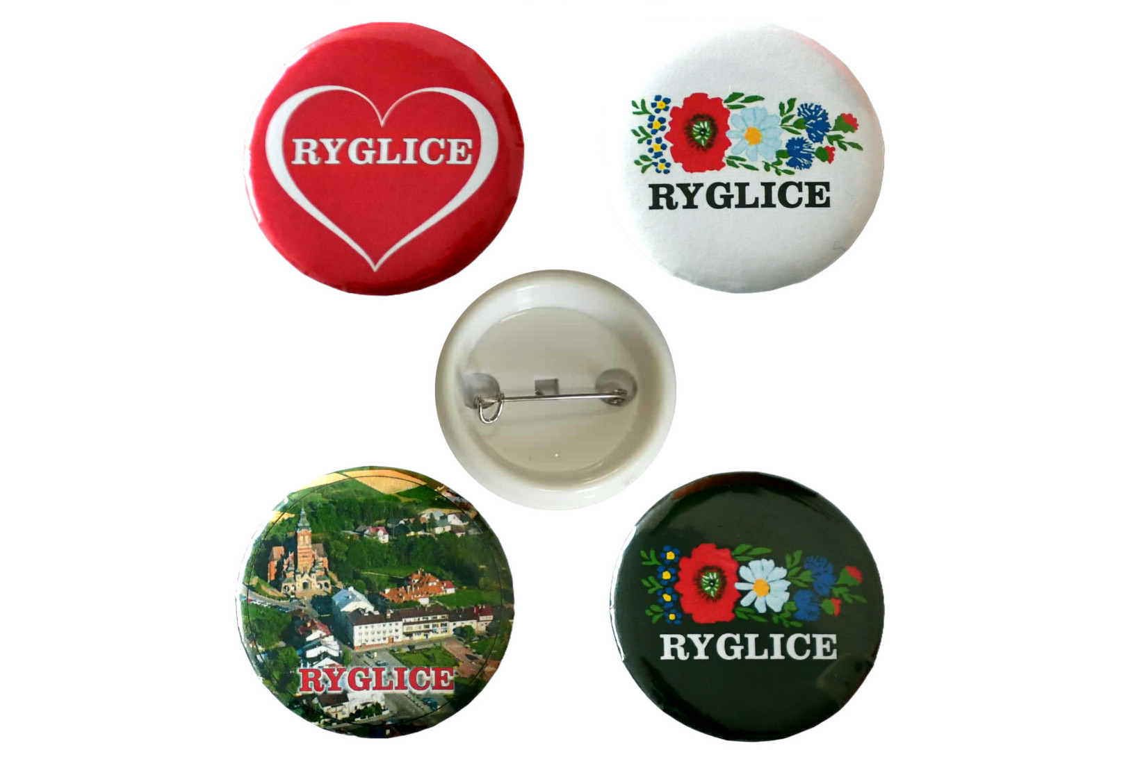 Przypinka o średnicy 44 mm z napisem Ryglice lub przypinka z własnym projektem.