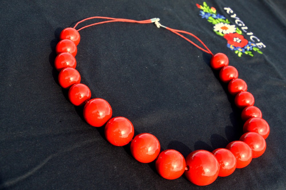 Czerwone korale wykonane z drewna. Korale są znakiem promocyjnym Małopolski