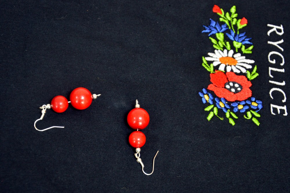 Czerwone kolczyki wykonane z korali drewnianych