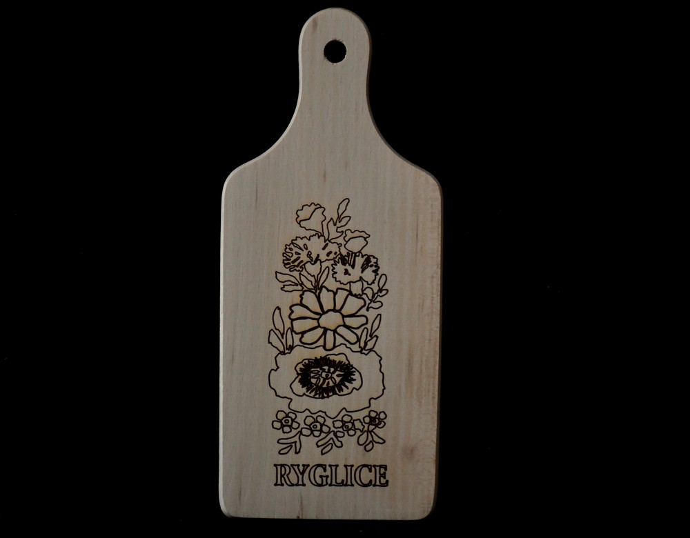 Deska kuchenna z ryglickim motywem kwiatowym wykonanym metodą pirografiiDługość ok. 26,5 cm, szerokość ok. 11,5 cmPrzedmiot może się nieznacznie różnić od przedstawionego na fotografii