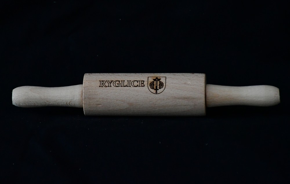 Mały drewniany wałek kuchenny z napisem i herbem gminy Ryglice wykonanym techniką pirografiiPrzedmiot może się nieznacznie różnić od przedstawionego na fotografii