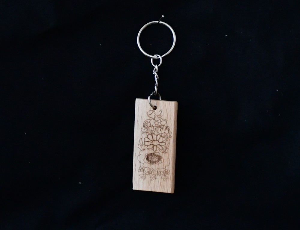 Brelok z drewna z ryglickim motywem kwiatowym wykonanym metodą pirografiiDługość części drewnianej ok. 8 cmPrzedmiot może się nieznacznie różnić od przedstawionego na fotografii